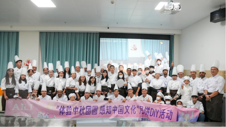 到达新疆爱里蛋糕工厂总部后,留学生们迫不及待地进入月饼制作体验车间,换上专业的烘焙服,戴上厨师帽,大家神气十足,感觉自己已经是一名真正的烘焙师了。洗手消毒后进入车间,经验丰富的师傅简单明了地介绍了月饼制作的技巧,大家就上手开始制作。每个人都认真投入地沉浸在月饼制作的快乐中,压开面皮,放上馅料,慢慢地将馅料一点点包裹进去,最后拿模具压成各种各样漂亮的样子。