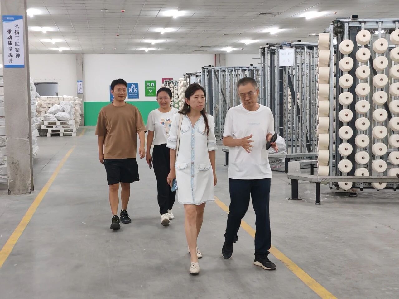 嘉泰作为南疆地区纺织行业的佼佼者,拥有先进的生产设备和成熟的工艺流程,其持续的技术创新和卓越的品质赢得了市场的广泛认可。在调研过程中,李教授一行深入生产车间,现场观看了解了从原料到坯布的生产过程,亲眼见证了先进纺织设备的高效运转和精湛工艺的运用。段景周向李教授一行详细介绍了嘉泰的生产流程、用工情况、质量控制以及技术创新、品牌建设、市场拓展等方面的内容,强调了人才在推动企业发展中的重要作用。