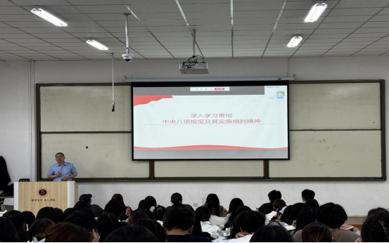 5月12日,朱宪臣老师以《中央八项规定及其实施细则》为题开启首场讲座。通过"制度解读+案例警示",深度解析中央八项规定及其实施细则的政治意蕴。引导学员深刻认识"四风"问题的顽固性反复性。特别强调新时代青年要系好"第一粒扣子",将纪律规矩转化为日用而不觉的行为准则。