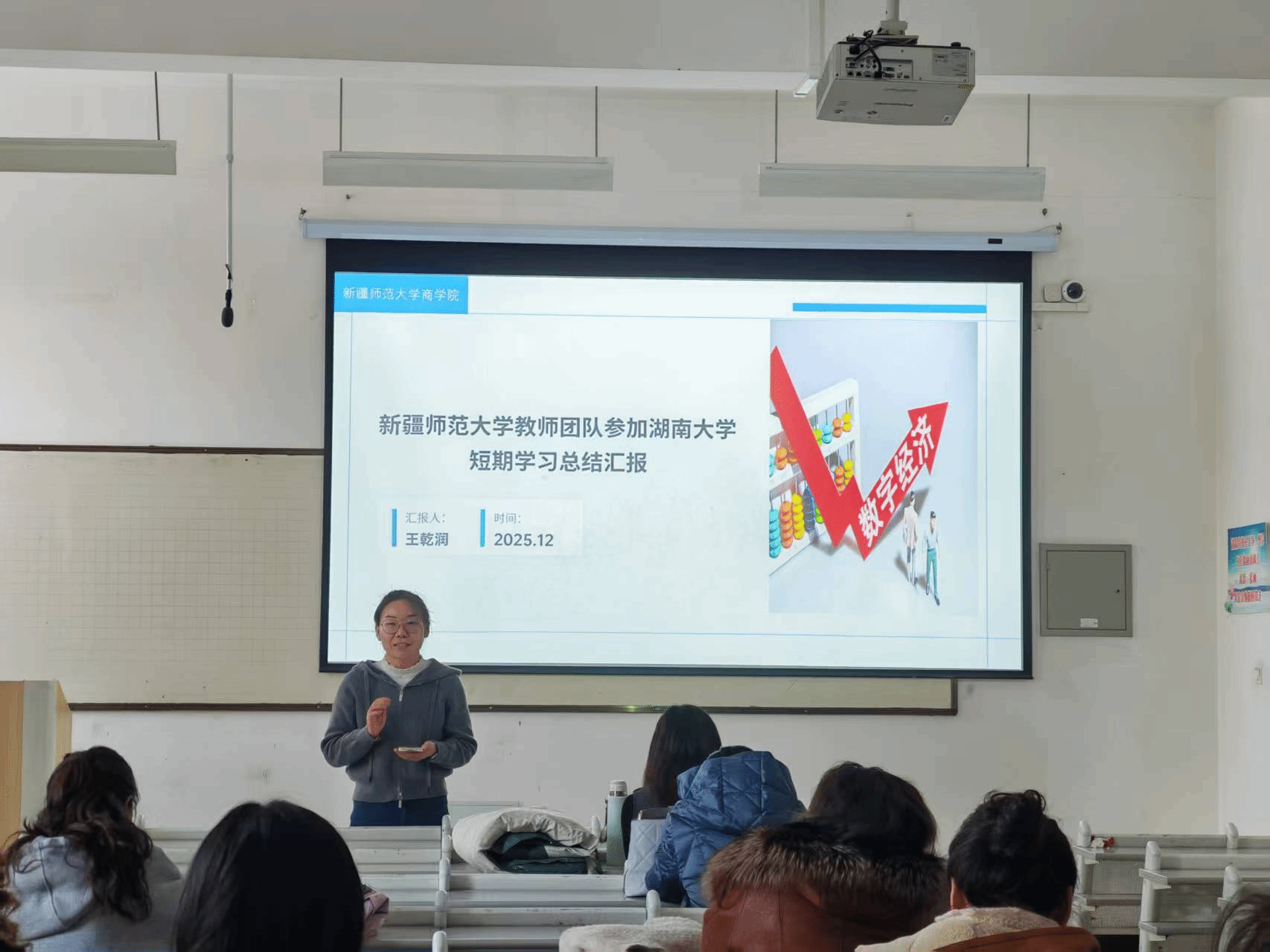安排教师团队奥布力·塔力普、王乾润、李征帛、王香艳一行4人于2024年11月23日至30日赴湖南大学经济与贸易学院开展短期学习交流。12月17日,参与学习的老师们向全院进行学习情况汇报。